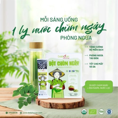 Bột chùm ngây DalaHouse sản xuất từ 100% chùm ngây tươi được trồng và thu hoạch tại trang trại organic tại Đơn Dương, Lâm Đồng. Chúng tôi sử dụng công nghệ sấy lạnh hiện đại tiêu chuẩn Châu Âu và công nghệ nghiền thực phẩm ở nhiệt độ thấp giúp bảo toàn các enzym và chất dinh dưỡng của rau củ, đảm bảo uy tín về chất lượng cũng như nguồn gốc với quy trình khép kín đạt chứng nhận FDA. Sản phẩm phù hợp bổ sung rau củ cho cả gia đình ngay cả khi bận rộn.