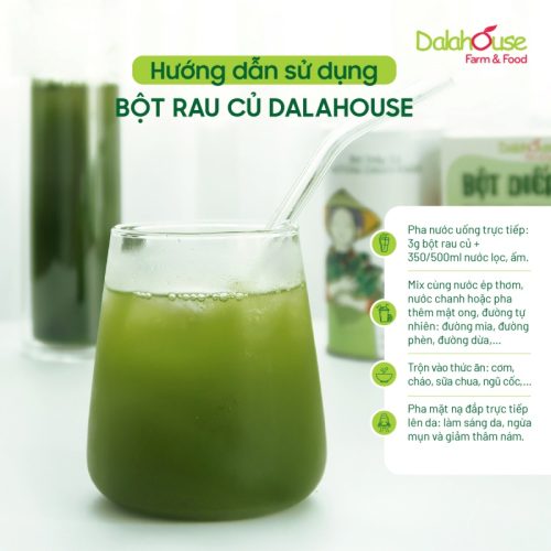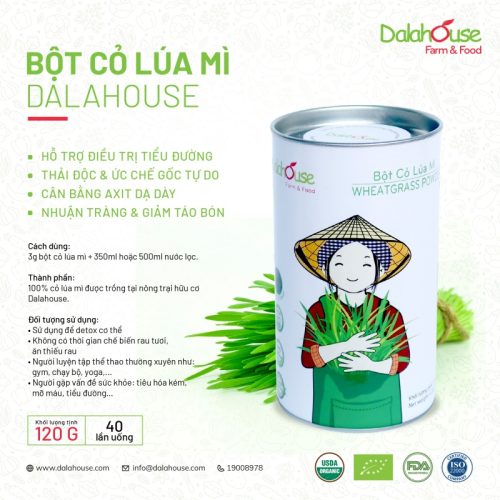 - Nguyên chất 100%: Được làm từ cỏ lúa mì hữu cơ được trồng và thu hoạch tại trang trại của Dalahouse, Lâm Đồng.
