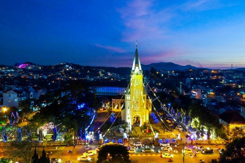 Đà Lạt vào dịp Giáng sinh được trang hoàng rực rỡ. Các nhà thờ, con đường, quán cà phê nổi tiếng như Horizon Coffee, The Wilder-nest đều được trang trí đậm chất lễ hội với cây thông, ánh đèn lung linh. Đặc biệt, Nhà thờ Con Gà và Nhà thờ Domaine de Marie là những điểm đến không thể bỏ qua để cảm nhận sự trang nghiêm và ấm áp của mùa lễ.