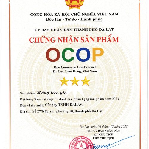 Sản phẩm Hồng treo gió tại DaLaVi vinh dự là một trong những sản phẩm của cửa hàng đạt chứng nhận OCOP (One Commune One Product Of Viet Nam). Đây là kết quả rất đáng tự hào cho sự nổ lực không ngừng trong nhiều năm qua của công ty TNHH DaLaVi, từ đó trở thành động lực thúc đẩy tạo ra nhiều sản phầm chất lượng và giá trị hơn, giúp nâng tầm nông sản Việt.