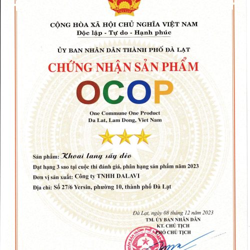 Sản phẩm Khoai lang đẻo tại DaLaVi vinh dự là một trong những sản phẩm của cửa hàng đạt chứng nhận OCOP (One Commune One Product Of Viet Nam). Đây là kết quả rất đáng tự hào cho sự nổ lực không ngừng trong nhiều năm qua của công ty TNHH DaLaVi, từ đó trở thành động lực thúc đẩy tạo ra nhiều sản phầm chất lượng và giá trị hơn, giúp nâng tầm nông sản Việt.